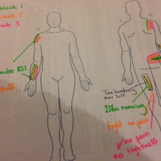 Did it take hours? Yes, was it enjoyable? No, was it useful? Surprisingly yes! Being able to say to a client still dubious about the effectiveness of treatment, ‘3 weeks ago you had disturbed sleep for most of the week, this week you’ve had disturbed sleep once’, or seeing someone light up at the improvement when you ask them to squat and compare the depth to the previous week, being able to show a body map to a client that shows an improvement in levels of discomfort. For the 1st time in a long time I feel I’m filling in meaningful paperwork.