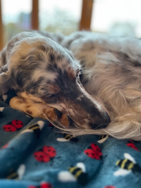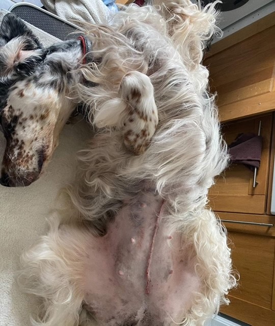 Rosie has been a client of mine for some time. She is the first English Setter I have worked with and has taught me a huge amount about breed. Around late February last year (2023) after a series of UTI’s her guardian and I started noticing changes in both Rosie’s conformation and behaviour. Diligently her guardian sought further veterinary advice and in March our worse fears were confirmed. Rosie had a large mass that was blocking both her bladder and bowel.