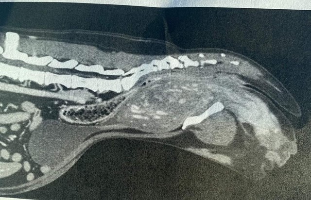 The removal of this mass was not straight forward, the mass ruptured during surgery, causing a large bleed, resulting in Rosie becoming critically ill in the days that followed. During this time a heart murmur developed and her guardian was advised to manage her expectations about whether Rosie would be returning home.